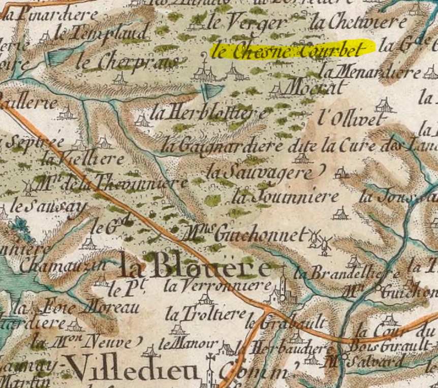 C’est sans doute Sébastien qui s’occupe du mariage de sa sœur. Ce n’est pas un tailleur d’habits mais un tuilier que Jeanne épouse aux alentours des années 1660, il a pour nom Pierre LEFORT et son ascendance m’est inconnue. Il emmène Jeanne avec lui au village du Chêne Courbé – qui s’écrivait en ce temps-là Chesne Courbet – et où elle passera le reste de sa vie.