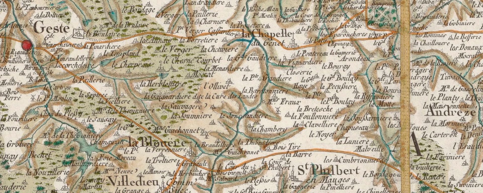 Certains arbres donnent pour ascendance à Pierre LEFORT, le couple Pierre LEFORT et Mathurine SUPIOT qui effectivement vivent à Villedieu-La-Blouère et pourraient être les parents du mari de Jeanne. Seulement, j’ai retrouvé le mariage de de l’un de leurs fils, André. Si ce dernier est le frère de Pierre, on devrait voir apparaître quelques liens de parenté entre les deux hommes, mais rien de tel… Cette absence de preuve en est plutôt une ; Pierre LEFORT vient sans doute d’ailleurs…
