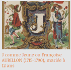 J comme Jeune à son Mariage sur le blog Mes Racines Familiales de Benoît, parfait écho de mon J comme Jeune ou Françoise AURILLON (1715-1790), mariée à 12 ans.