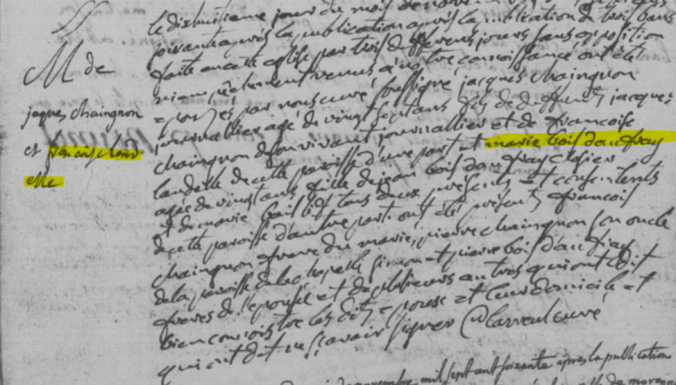 Ces registres, je les avais pourtant parcourus mais trop rapidement et j’étais passée à côté de l’acte, d’autant plus qu’on avait écrit dans la marge que ce mariage était celui de Jacques CHAIGNON et de … Françoise LANDELLE, confondant ainsi la mère de l’époux avec l’épouse ; or, à mes débuts, je ne lisais que les noms dans la marge… Fatale erreur !