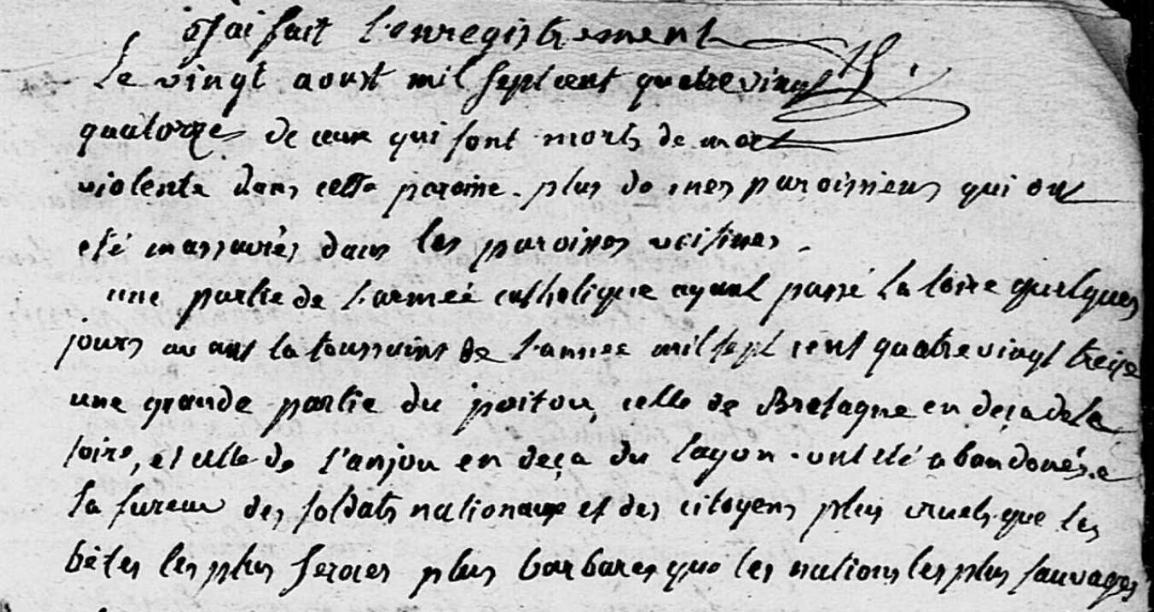 J’ai fait l’enregistrement le vingt aoust mil sept cent quatre vingt quatorze de ceux qui sont morts de mort violente dans cette paroisse, plus des mes paroissiens qui ont eté massacrés dans les paroisses voisines. Une partie de l’armée catholique ayant passé la Loire quelques jours avant la Toussaint de l’année mil sept cent quatre vingt treize, une grande partie du Poitou, celle de Bretagne, en deçà de la Loire, et celle de l’Anjou en deçà du Layon, ont été abandonnées à la fureur des soldats nationaux et des citoyens, plus cruels que les bêtes les plus féroces, plus barbares que les nations les plus sauvages.