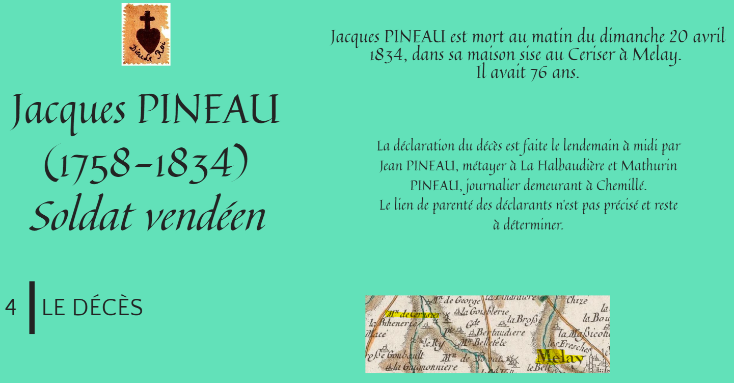 Jacques PINEAU s’est éteint au matin du 20 avril 1834 à l’âge de 76 ans dans sa maison de Cerisier à Melay où il demeurait sur la fin de sa vie.
