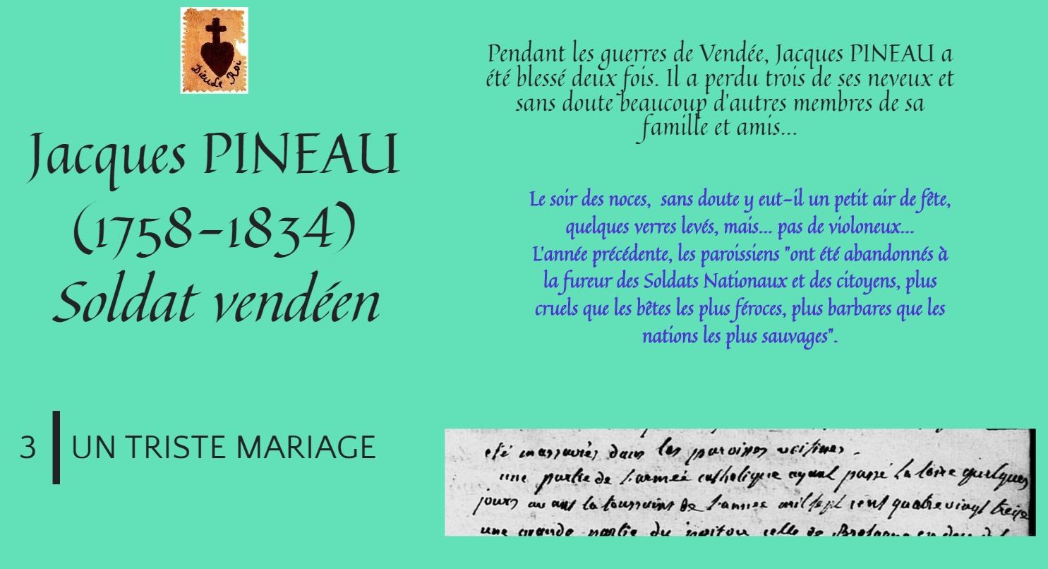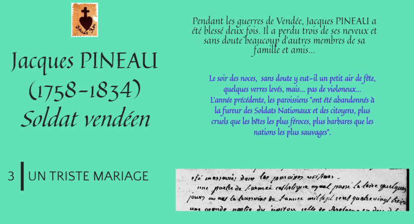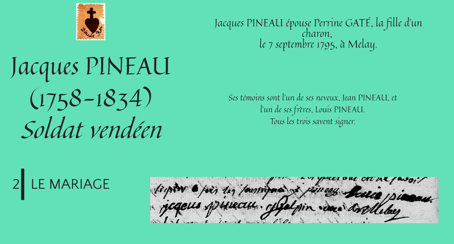 C’est en 1795, alors qu’il est déjà âgé de 37 ans, que Jacques PINEAU épouse Perrine GATÉ, la fille d’un charon de Melay. Ses parents sont déjà morts, avant même les débuts des Guerres de Vendée, Jacques est donc assisté d’un neveu, Jean PINEAU, et de l’un de ses frères, Louis PINEAU.