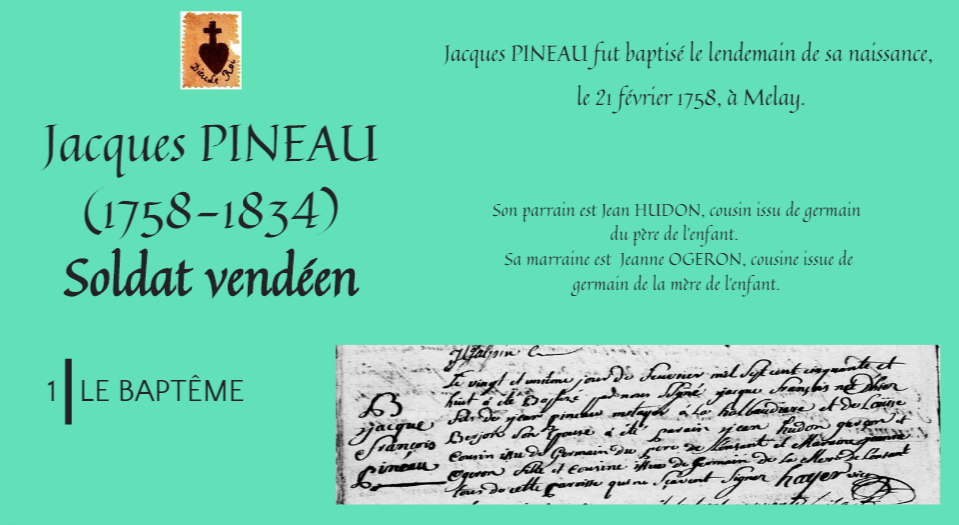 Jacques PINEAU, ou plus exactement Jacques François PINEAU, fut baptisé le lendemain de sa naissance, le 21 février 1758. Il était né en plein coeur de l’hiver, à la métairie de La Halbaudière, à Melay.