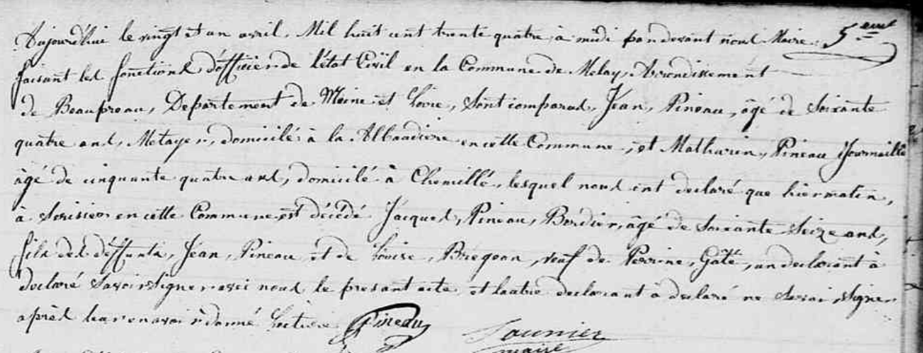 Aujourd’hui le vingt et un avril mil huit cent trente quatre à midi par devant nous maire faisant les fonctions d’officier de l’état Civil en la commune de Melay, Arrondissement de Beaupreau, Département de Maine et Loire, sont comparus Jean PINEAU, âgé de soixante quatre ans, métayer, domicilié à La Albaudière en cette commune, et Mathurin PINEAU, journailler, âgé de cinquante quatre ans, domicilié à Chemillé, lesquel nous ont declaré que hier matin, à Serisier en cette commune est dédédé Jacques PINEAU bordier, âgé de soixante seize ans, fils de deffunts Jean PINEAU et de Louise BREGEON, veuf de Perrine GÂTÉ, un declarant à declaré savoir signer avec nous le presant acte et l’autre declarant a declaré ne savoir signer après leur avoir donné lecture.