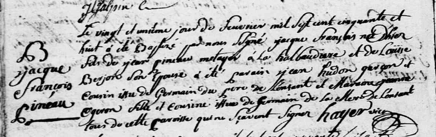 Le vingt et unieme jour de feuvrier mil sept cent cinquante et huit a été baptizé par nous soussigné Jacque François né d’hier fils de Jean PINEAU métayer à La Halbaudière et de Louise BERJON son épouse, a été parain Jean HUDON garçon et cousin issu de germain du père de l’enfant, et maraine Jeanne OGERON fille et cousine issue de germain de la mère de l’enfant, tous de cette paroisse qui ne sçavent signer.