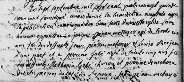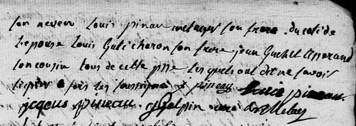 Le sept septembre mil sept cent quatre vingt quinze nous curé soussigné avons donné la bénédiction nuptiale après la publication canonique des bans faite dans cette église sans aucune opposition à Jacque PINEAU métayer, âgé de trente cinq ans, fils des deffunts Jean PINEAU métayer et Louise BREJEON d’une part et à Perrine GATÉ, âgée de trente cinq ans, fille des deffunts Mathurin GATÉ charon et Perrine DENECHERE ; ont été présens du coté de l’époux, Jean PINEAU metayer son neveu, Louis PINEAU métayer son frère, du côté de l’épouse, Louis GATÉ charon son frère, Jean GACHET tisserand son cousin, tous de cette paroisse, lesquels ont dit ne savoir signer fors les soussignés. (Signé – J. Pineau – Louis Pineau – Jaques PINEAU).