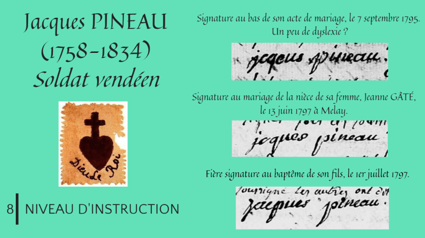 Jacques PINEAU savait au moins écrire son nom. Difficile d’en savoir plus sur son instruction. Sans doute a-t-il appris à écrire avec le curé GALPIN qui refusa de  prêter serment et continua à tenir ses registres pendant les Guerres de Vendée.