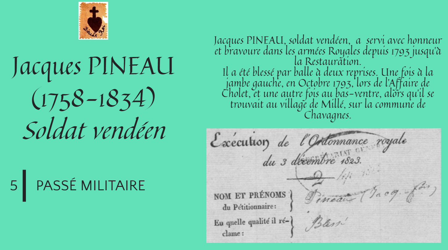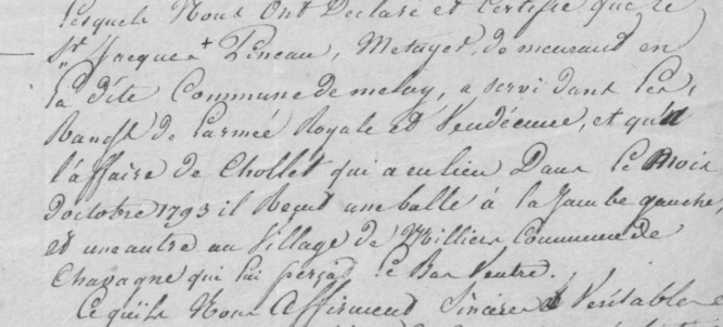 « Lesquels nous ont declaré et certifié que le sieur Jacques *François PINEAU, métayer demeurant en la dite commune de Melay, a servi dans les rangs de l’armée Royale et Vendéenne et qu’à l’affaire de Chollet qui a eu lieu dans le mois d’octobre 1793, il reçut une balle à la jambe gauche et une autre au village de Milliers, commune de Chavagne qui lui perçat le bas ventre. »