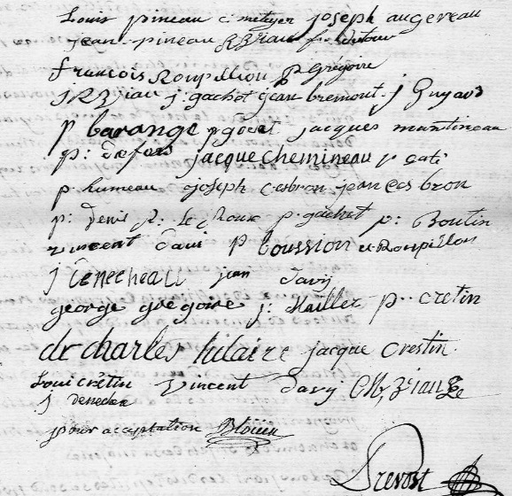 Lui ne signe pas encore, mais on trouve au milieu de bien d’autres signatures, qui d’ailleurs ne me sont pas inconnues, celle de son frère aîné, Louis PINEAU.