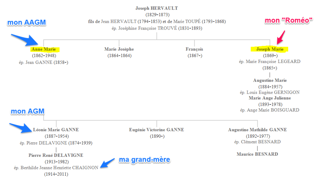 Joseph Marie HERVAULT, qu’il m’a plu d’imaginer en « Roméo arthurien », était le petit frère d’Anne-Marie HERVAULT, l’une de mes arrière-arrière-grand-mère, dont j’ai évoqué l’histoire précédemment. Il était né le 28 juillet 1869 à Iffendic. En 1892, il épousa Marie Françoise LEGEARD, une jeune veuve âgée de 27 ans. Sur leur acte de mariage, les deux époux reconnaissent qu’ils ont eu auparavant une fille, née hors mariage, le 25 août 1884. Joseph avait alors tout juste quinze ans et Marie, dix-neuf…