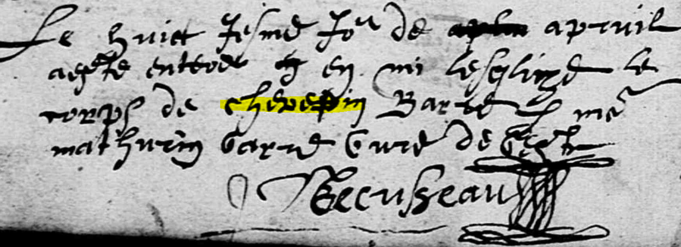 Le huictiesme jour de apvril a esté enterré en mi l’ésglise, le corps de Chrespin BARRE par moy Mathurin BARRE curé de ceans.