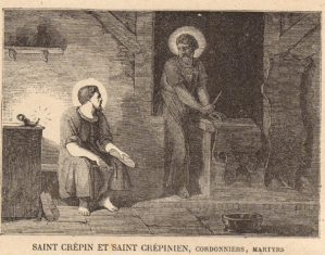 Saint Crépin est fêté le 25 octobre. Issu d’une noble famille du IIIe siècle, il s’installe avec son frère, Crépinien,  à Soissons afin d’évangéliser les Gaules. Ils y exercent le métier de cordonnier et en profitent pour prêcher la bonne parole aux clients qui viennent à leur atelier. Ils seront victimes de l’empereur Maximilien qui les fait torturer avant de les faire décapiter. Saint Crépin est le patron des artisans qui travaillent le cuir.