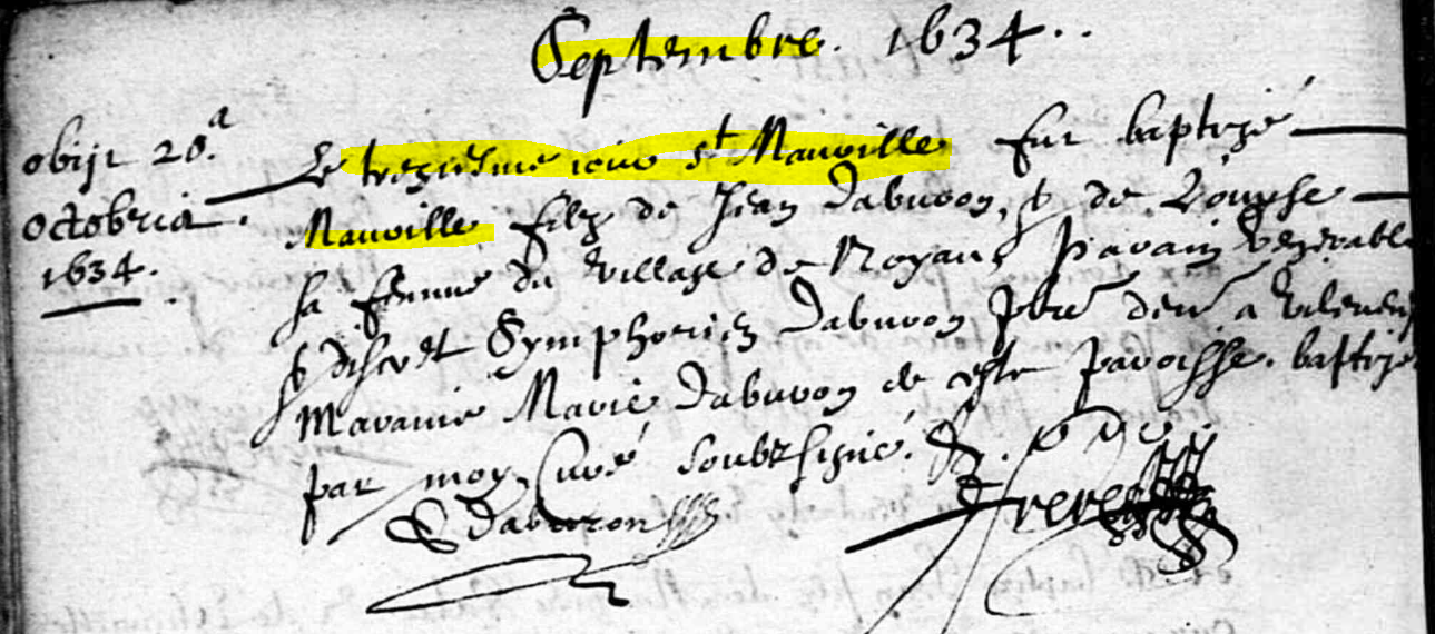 Maurille DABURON, baptisé le 13 septembre 1634, à Bauné, « jour Saint Maurille ».