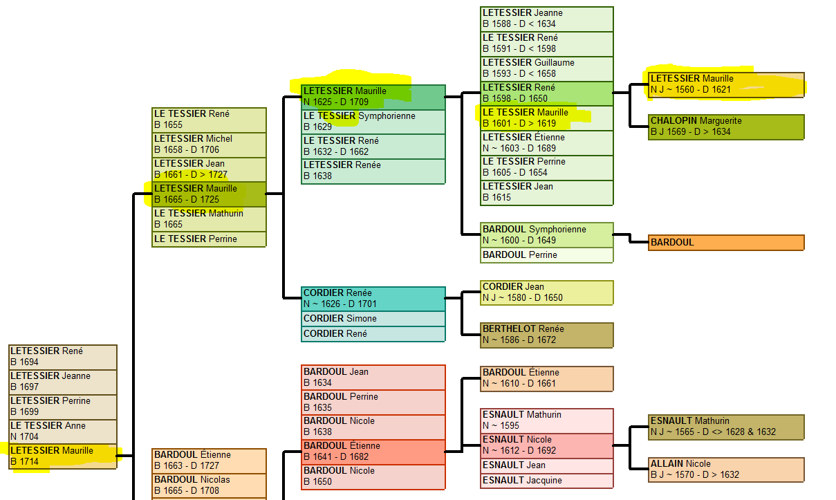 Baptisé le 25 février 1625 au Plessis-Grammoire, époux de Renée CORDIER avec laquelle il se marie en 1654, toujours au Plessis-Grammoire, Maurille LETESSIER, mon ancêtre sosa 4000 (ascendant de mon sosa 1000), était marchand. Il est à la fois, petit-fils de Maurille LETESSIER (né vers 1560) , père de Maurille LETESSIER (né en 1665), neveu de Maurille LETESSIER dit Le Jeune (né en 1601), et grand-père de Maurille LETESSIER (né en 1714), ou, ce qui revient au même, j’aurais pu écrire que son grand-père, l’un de ses oncles, l’un de ses neveux et l’un de ses fils s’appelaient également Maurille LETESSIER !