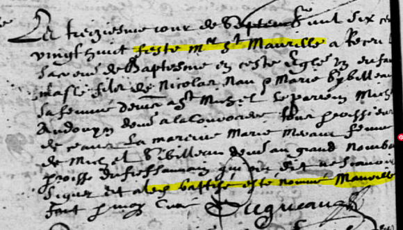 Maurille NAU, baptisé le 13 septembre 1628, au Fief-Sauvin, le jour de la « feste Monsieur Saint Maurille« .