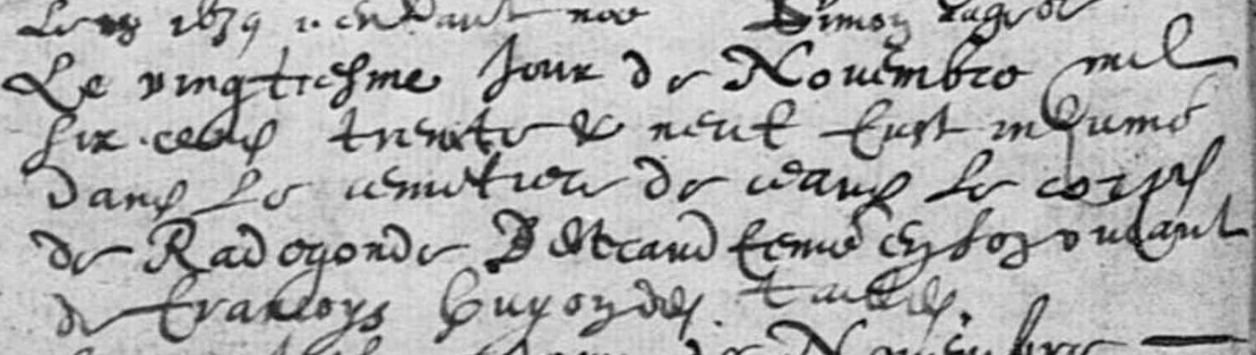 Le vingtiesme jour de novembre mil sis cens trente et neuf fust inhumé dans le cimetiere de ceans le corps de Radegonde BERTRAND femme en son vivant de François GUYON des Tailles.