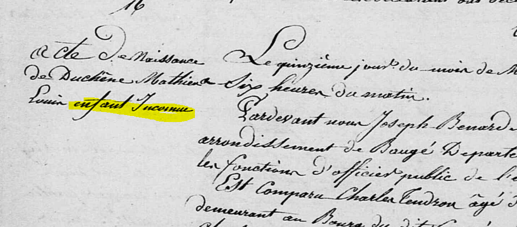 Le quinzieme jour du mois de mars l’an mil huit cent vingt trois six heures du matin, par devant nous Joseph BENARD, maire de la commune de Fougeré, arrondissement de Baugé, Département de Maine et Loire faisant les fonctions d’officier public de l’état-civil de la dite commune, est comparu Charles TENDRON âgé de trente huit ans, instituteur et demeurant au bourg dudit Fougeré, époux de Marie COQUEREAU, le dit Charles TENDRON nous a déclaré que sur les quatre heures du matin, il a entendu frapper à sa porte, et il s’est levé pour voir qui était à sa porte, il a trouvé sur le seuil de sa porte un petit paquet de mauvaise toille blanche de nul valeur, ayant ouvert le dit paquet, a reconnu qu’il y avait un enfant du sexe masculin, emmailloté dans de mauvais chiffons de toille de nul valleur, ledit Charles TENDRON ayant été de suite chez Mathieu BOISAUX cordonnier, âgé de soixante douze ans et demeurant au bourg de Fougeré, qui l’a accompagné pour lever dit enfant. Après nous avoir représenté ledit enfant, avons reconnu qu’il était du sexe masculin, qu’il paraissait âgé d’un ou deux jours et n’ayant aucune marque sur le corps, nous l’avons declaré inconnu. De suite avons inscrit ledit enfant sous le nom de DUCHÊNE, et lui avons donné pour prénoms Mathieu Louis, et l’avons confier provisoirement aux soins de la femme Marie COQUEREAU épouse du dit Charles TENDRON, laquelle a déclaré vouloir bien s’en charger jusqu’à ce qu’il soit autrement ordonné, de quoi avons dressé le présent acte en présence des sieurs Mathieu BOISEAUX âgé de soixante douze ans, cordonnier, et François BRICHER âgé de trente huit ans, les deux demeurant au bourg du dit Fougeré. Après lecture le premier témoin il a signé, à l’égard du second il a declaré ne le savoir. Mathieu Boyaux. Benard.