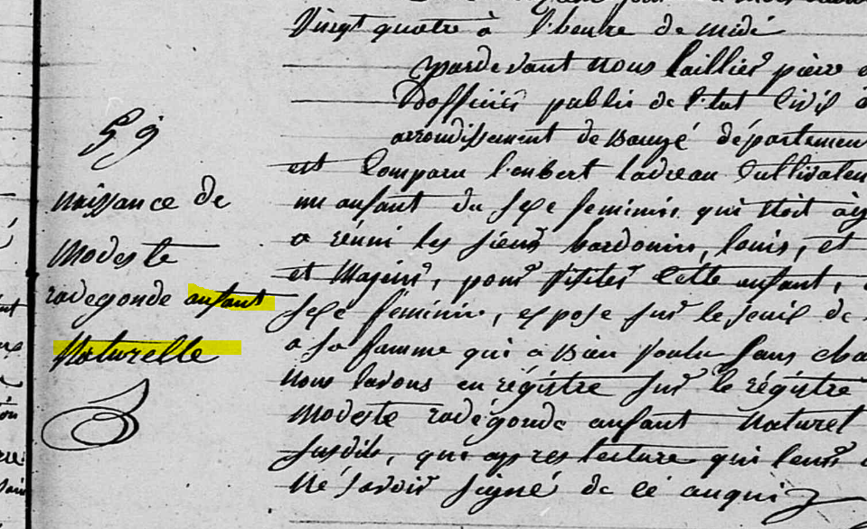 Modeste est un prénom modeste… et pas vraiment féminin, d’accord. Radegonde étant pour moi le nom de famille, sinon, cet enfant n’aurait pas reçu de nom de famille… Elle a été déclaré déclarée le 12 août, la sainte Radegonde étant le 13 août.