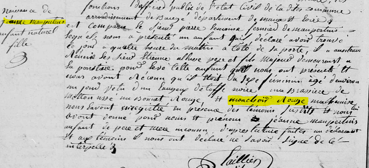 … est comparue la veuve MAHOUT demeurante à Bellais, laquelle déclare avoir trouvé le cinq du présent mois à sa porte vers les six heures du matin … un enfant vêtu d’un langeux de molton, une brassière pareil, un bonnet grie, un mouchoir rouge, une chemise fine de lain et n’ayant sur lui aucune marque ni infirmité… confiée de suite aux soins de la femme veuve MAHOUT… »