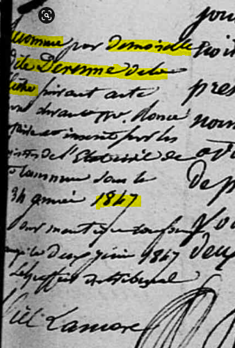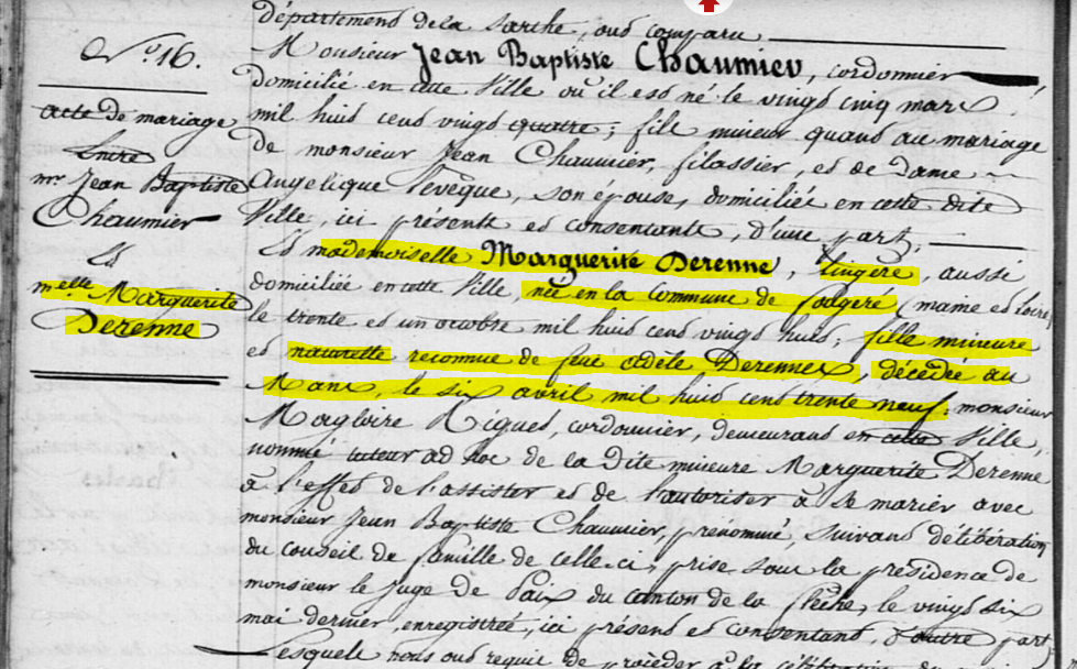 … Et mademoiselle Marguerite DERENNE, lingère, aussi domiciliée en cette ville, née en la commune de Fougeré (Maine et Loire), le trente et un octobre mil huit cent vingt huit, fille mineure et naturelle reconnue de feue Adèle DERENNE, décédée au Mans, le six avril mil huit cent trente neuf, Monsieur Magloire RIGUET cordonnier, demeurant en cette ville, nommé tuteur ad hoc de la dite mineure Marguerite DERENNE à l’effet de l’assister et l’autoriser à se marier avec monsieur Jean-Baptiste CHAUMIER prénommé, suivant délibération du conseil de famille de celle-ci, prise sous la présidence de Monsieur le Juge de Pais du canton de La Flèche, le vingt six mai dernier, enregistré ici présent et consentant d’autre part…