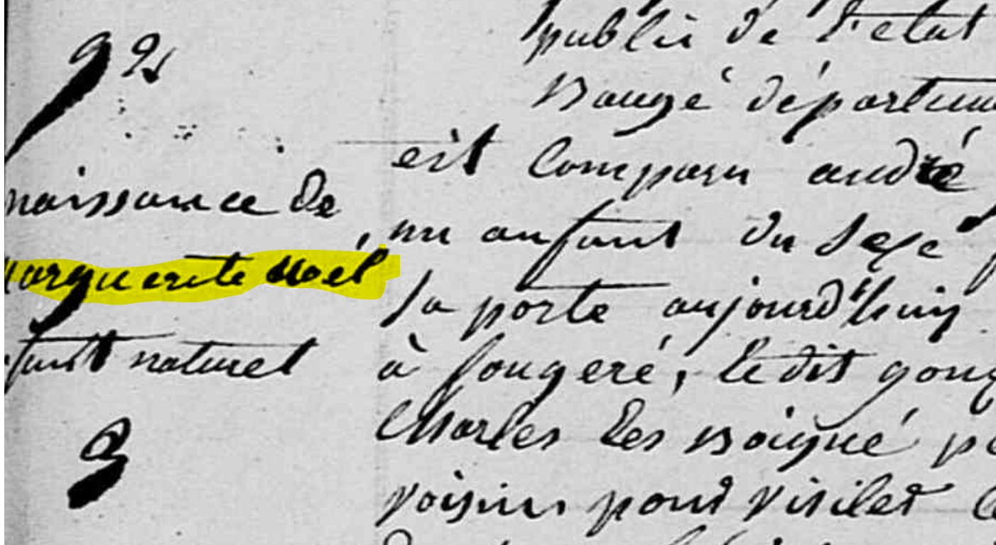 … est comparu André GOUZÉ, cultivateur, lequel nous a présenté un enfant du sexe féminin, qu’il déclare avoir trouvé exposé à sa porte aujourd’hui à deux heures en sa maison aux Herrières à Fougeré, ledit GOUZÉ a aussiteau réuni les sieurs Charles et Charles les BOIGNÉ, père et fils, les deux majeurs, cultivateurs, s’est voisins pour visiter cette anfant et ils ont reconnu qu’il etoit du sexe féminin, âgé de dix à douze jours ayant sur lui un billet sur lequel il est dit Je suis un anfant qui a reçu le bapteme, étant vetu très pauvrement, s’est pourquoi il n’est pas fait mantion de sest effets, cette déclaration nous a été faite en présence des dits témoins … Confiée aux soins de la femme GOUZÉ, fils du déclarant…