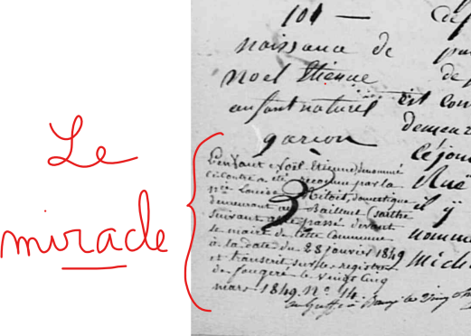 Le petit miracle est inscrit dans la marge de cet acte de naissance. Le 28 janvier 1849, soit vingt ans plus tard, l’enfant est reconnu par sa mère, Louise RITOIT, domestique à Bailleul, dans la Sarthe.