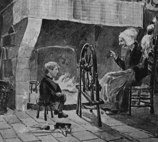 Cependant elle souriait, de son sourire ébaubi, la chère vieillarde bonne comme du gâteau (disions-nous à l’époque)… et elle reprenait de plus belle à virer la thie et à tirer les brins de linon soyeux, sous le ruban en ramages qui en enroulait la poupée autour de la fourche de néflier roui. – Ses coups d’œil résignés et câlins promenaient, comme des reflets, sur ma mère, probe ménagère, assise à son côté et tricotant avec assiduité, sur nous deux, mon mère qui lui tournait le dos et moi qui l’avais quasi en face, sur mes deux grand’mères, ses contemporaines, taciturnes devant l’âtre, et sur les personnages d’images toujours debout dans les cadres enfumés le long des murs, – comme pour se demander si elle agréerait à tant de monde à la fois.