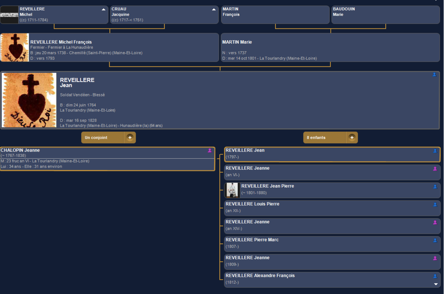 Les faits relatés dans cet article se sont déroulés à La Hunaudière dans la paroisse de La Tourlandry. Il n’a pas été aussi facile que je le pensais de retrouver l’identité de Jean REVEILLERE, de nombreuses branches se mêlant sans cesse, accumulant les Jean, les Pierre, les Michel, mais aussi hélas ! les Pierre Jean, les Jean Pierre ou encore les Michel Pierre, tous REVEILLERE ! Néanmoins, après d’assez longues recherches, aussi bien dans les registres paroissiaux que dans les dossiers vendéens, j’ai pu déterminer que Jean REVEILLERE était très certainement le fils de Michel François REVEILLERE et de Marie MARTIN. Né en 1764, il rejoignit, quelque 30 ans plus tard, les Armées Royales de l’Ouest et participa activement aux différentes « Affaires » où il fut blessé à plusieurs reprises. Il perdit son père et deux de ses frères de l’autre côté de la Loire. De retour à La Hunaudière, il découvrit que les Républicains avaient effectivement mis le feu à sa maison de La Hunaudière et tout brûlé. Certains dossiers vendéens parlent même de deux sœurs enlevées et tuées… Il se maria à Jeanne CHALOPIN et eut beaucoup d’enfants, dont l’un, au moins, fut prêtre.