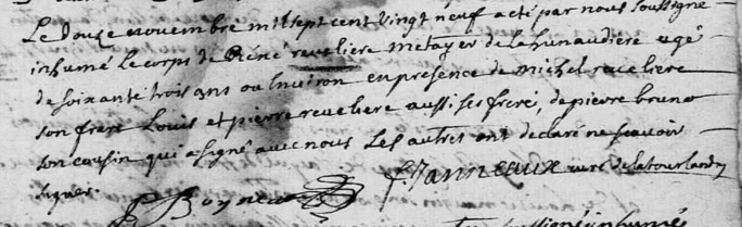 Le douze novembre mil sept cent vingt neuf a eté par nous soussigné inhumé le corps de René REVELIERE métayer de La Hunaudière égé de soixante trois ans ou environ, en présence de Michel REVELIERE son frère, Louis et Pierre REVELIERE aussi ses frères, de Pierre BRUNO son cousin qui a signé avec nous, les autres ont déclaré ne scavoir signer. P. Bruneau – F. Janneaux curé de la Tourlandry.