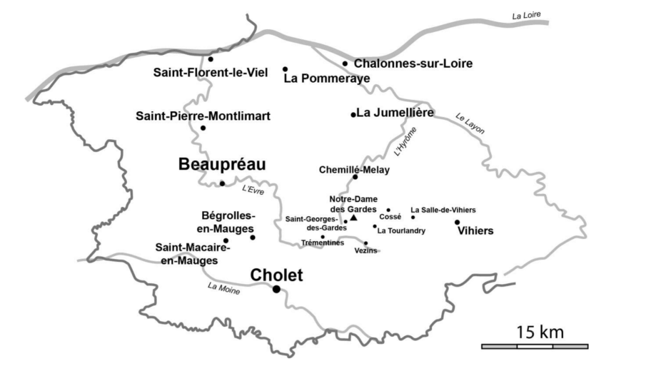 L’article que je reproduis ci-dessous, Jean REVEILLERE, de La Tour-Landry, est extrait du premier numéro du Bulletin de l’Œuvre de Notre-Dame des Gardes paru en mars 1898. Cette revue avait spécialement été créée afin de remercier les donateurs œuvrant pour la reconstruction de l’Abbaye Notre-Dame-des-Gardes. Le Bulletin existera de 1898 à 1903. Au fil des ans, on peut y découvrir les comptes-rendus sur l’évolution des travaux effectués sur l’Abbaye – accompagnés parfois même de quelques photos – mais aussi beaucoup d’articles historiques ayant trait aux Guerres de Vendée et se déroulant, bien évidemment, dans les Mauges, autour de Saint-Georges du-Puy-de-la-Garde. La plupart de ces articles sont écrits par le Chanoine UZUREAU, mais aussi parfois par d’autres personnages, comme c’est le cas ici, puisque l’article en question est signé par Abel FILLAUDEAU, doyen de Chemillé.