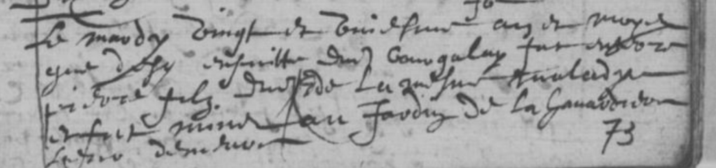 Le premier jour de décembre 1639 mourut Jehanne GODEBERT femme de deffunct Pierre BOURGALAY metaier de La Havardière. Ladite GODEBERT est aussy morte de la contagion. Elle estoit grosse de cinq moys et demy. Elle accoucha un quart d’heure devant la mort. L’enfant fut baptisé par les corbeaux qui y estoient. La fosse fut faicte au cimetiere dudit Gastines mays la sepulture fut [?] parce qu’ilz [?] contre la volonté du sieur curé.