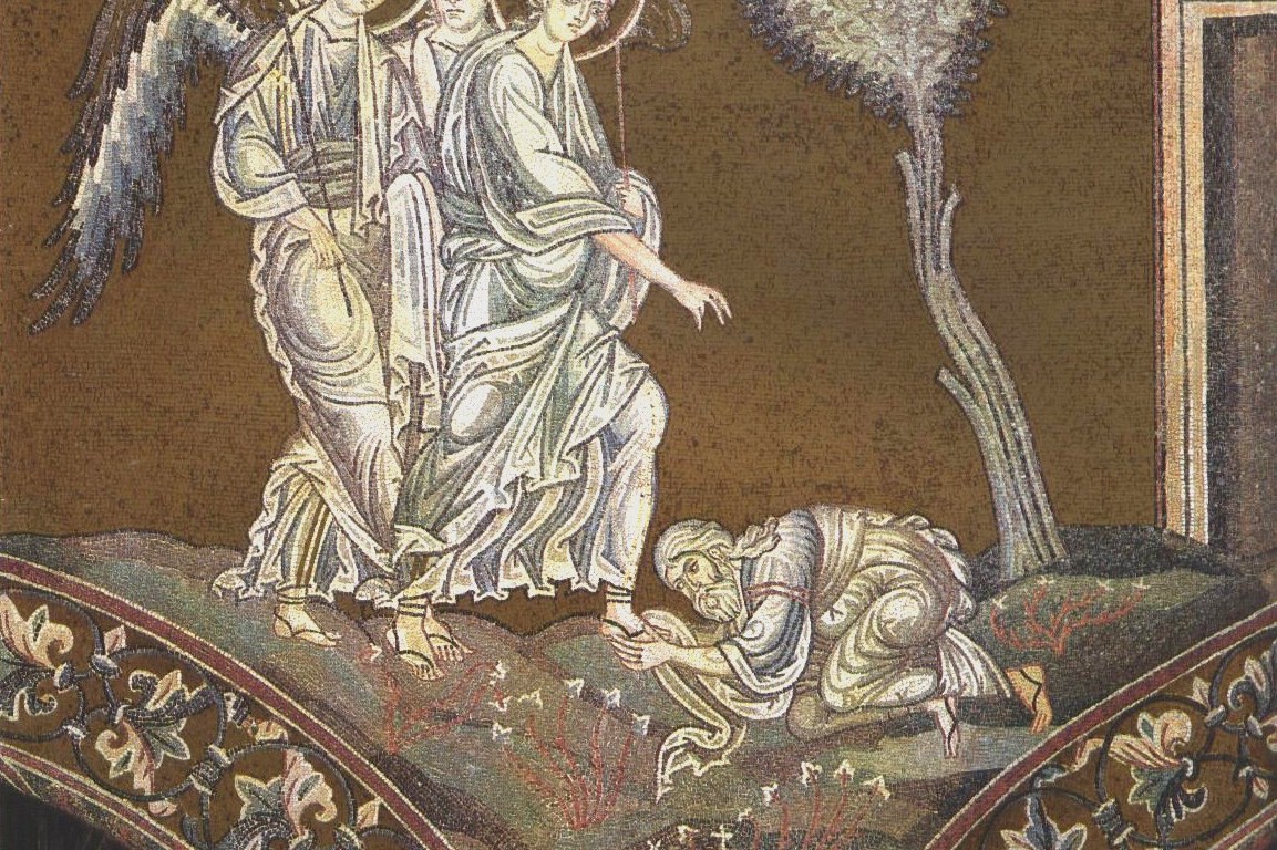 Vignette – Abraham se prosterne devant les trois Anges (mosaïque de la cathédrale de Monreale, XIIe siècle).