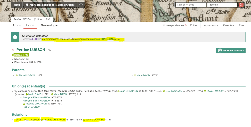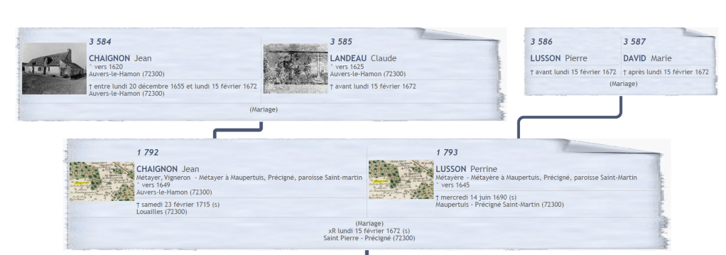 A titre d’information, Perrine LUSSON est mon ancêtre sosa 1793 (Génération 11). Elle était métayère à Maupertuis, paroisse Saint-Martin de Précigné, située de nos jours dans le département de la Sarthe.