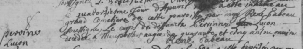 Grâce aux « Correspondances intelligentes de Geneanet », je peux d’ailleurs facilement corriger cette anomalie, et trouver rapidement l’acte de décès de Perrine LUSSON qui est morte effectivement le 14 avril 1690 à Précigné Saint-Martin. [Merci en particulier à l’arbre de Christian HOGER qui cite les numéros des vues.] Notons au passage que Jean CHAIGNON n’aura même pas attendu deux mois avant de se remarier…