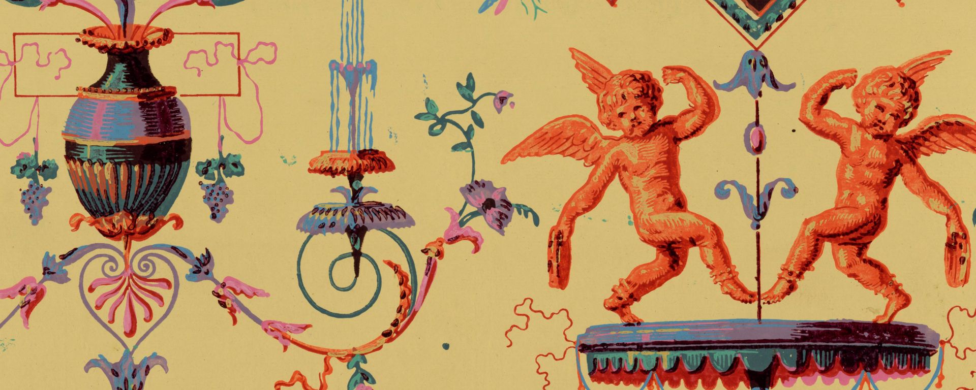 Vignette – Manufacture Bon. Papier à motif répétitif en arabesque à deux chemins en quinconce : deux putti dansant, Paris, 1799.(GallicaBnF)