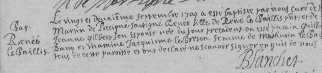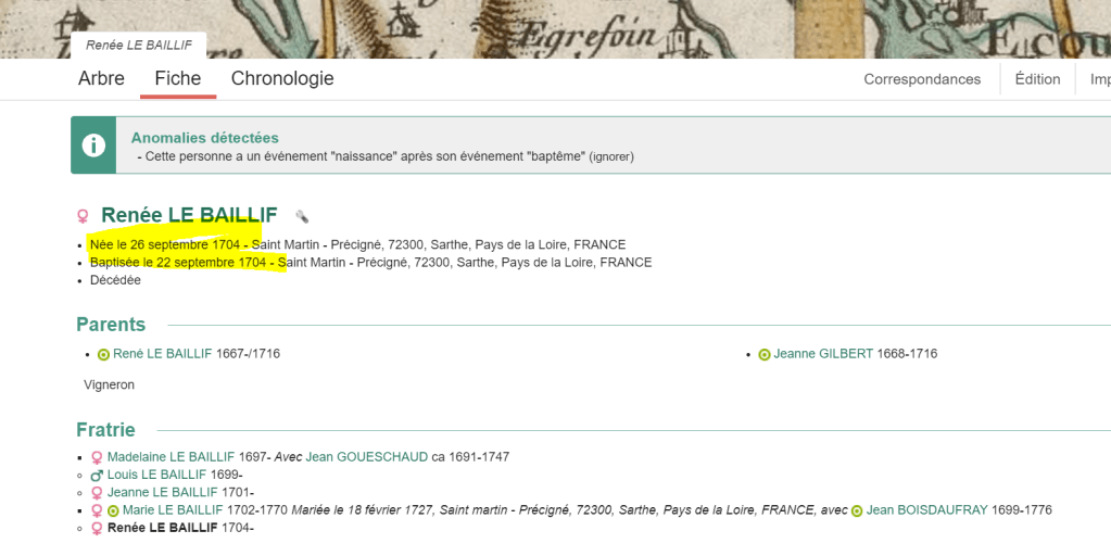 Petite anomalie pour Renée LE BAILLIF, dont le baptême précède la naissance, sans doute une erreur de frappe…
