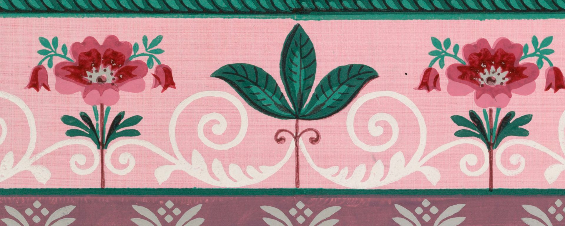 Vignette – Manufacture Jacquemart et Bénard. Bordure. Deux bandes, sur un fond de linon batiste, de frise de rinceaux alternant une feuille et une fleur stylisées, entre deux petites frises. Paris, 1800. (GallicaBnF)
