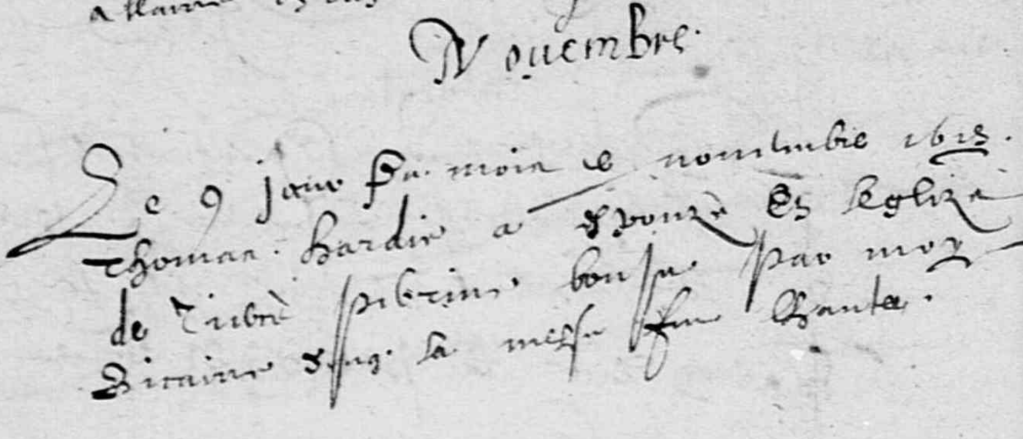 Le 9 jour du mois de novembre 1615 Thomas HARDIE a espouzé en l’églize de Tiercé Perrine BOUJU par moy vicaire soussigné la messe fut chantée.