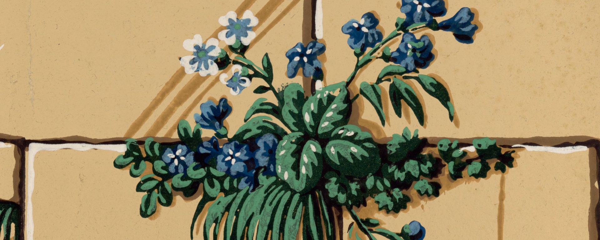 Vignette – Manufacture Bon. Papier à motif répétitif. Motif répétitif de trompe-l’œil de mur avec touffes d’herbe, fleurs et insectes. Paris, 1799.