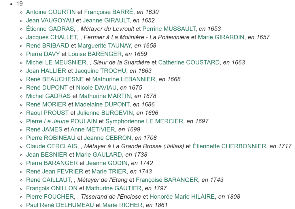 Ce n’est que vingt ans plus tard – ou presque – que je retrouve la trace de Françoise, dans la paroisse de Melay. Elle s’y marie en effet, le 17 novembre 1801, avec Jacques GOUGEON. Ce dernier est métayer à La Bouchetière et c’est là que désormais vivra Françoise THARREAU.
