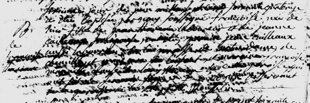 Le sixieme jour de juin mil sept cent soixante quatorze a été baptisée par nous soussigné, Françoise, née de hier, fille de Jean THAREAU laboureur et de Jeanne CAILLEAU son épouse, ont estés parain Jean CAILLEAUX aussi laboureur, de la paroisse de Notre Dame de Chemillé, et grand père de l’enfant, et maraine Françoise MAURILLE( ?) epouse de Louis THAREAU de cette paroisse quiont dit ne savoir signer, F. Chalopin desservant de la Paroisse de la Chapelle Rousselin.