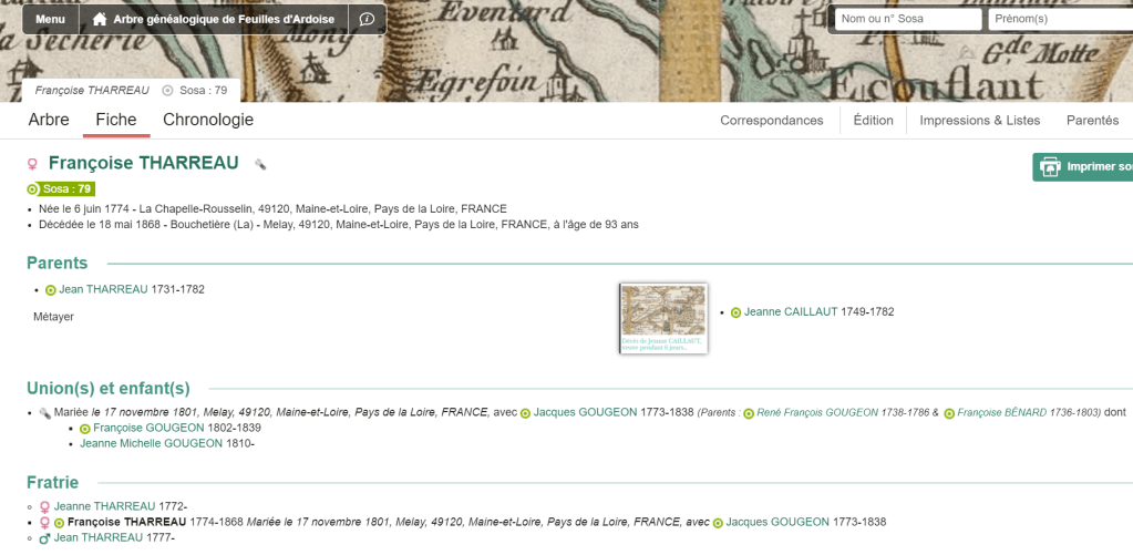 Françoise THARREAU est née le 6 juin 1774, l’année où Louis XVI devient roi de France. Agée d’une quinzaine d’années, elle connait la révolution de 1789 et elle traverse ensuite quasiment le 19ème siècle puisqu’elle s’éteint le 18 mai 1868.