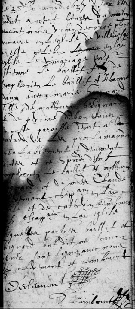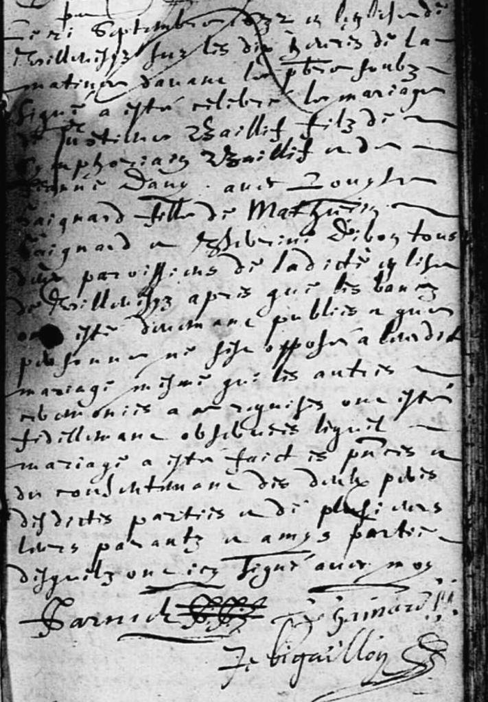 Le 21 septembre 1632 en l’église de Villevesque sur les dix heures de la matinée devant je prestre soubz signé a esté celebré le mariage de Estienne BAILLIF filz de Symphorien BAILLIF et de Jeanne DAVY avec Louyse GAIGNARD fille de Mathurin GAIGNARD et Perrine DIBON tous deux paroissiens de ladicte église de Villevesque apres que les bansz ont esté deuement publiés et que personne ne s’est opposé à leur dit mariage mesme que les autres cérémonies à ce requises ont esté fidellement observées, lequel mariage a esté faict es présences et du consentemant des deulx pères des dictes parties et de plusieurs leurs parantz et amys, partie desquelz ont icy signé avec moy.