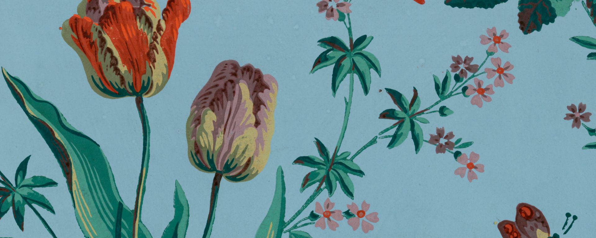 Vignette – Papier à motif répétitif à deux chemins, en quinconce, de groupe de fleurs au naturel (tulipes et primevères) dans un réseau de tiges fleuries à papillons. Paris, 1799.