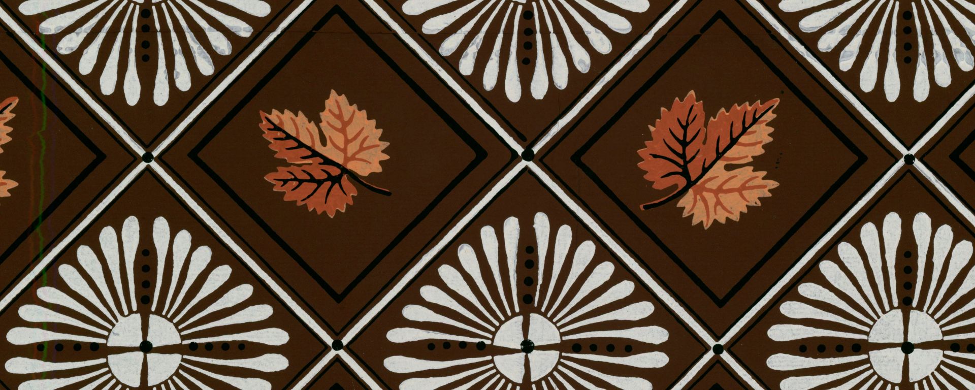 Vignette – Papier à motif répétitif à deux chemins, raccord droit, de carreaux ornés de feuilles et rosaces de fantaisie. Paris, 1799.