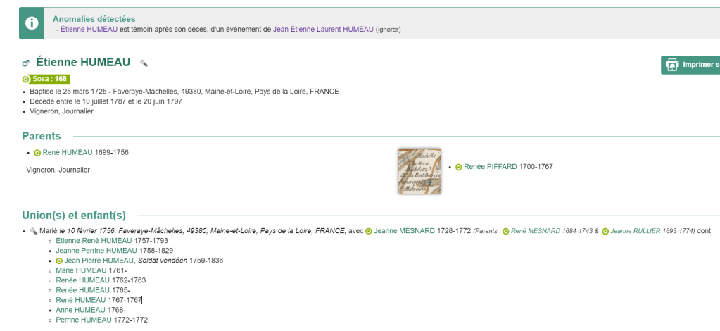 Difficile d’en apprendre davantage… Etienne HUMEAU a disparu entre le 27 octobre 1793 et 1797… Il était encore en vie le 27 octobre 1793 lors du décès de son fils Etienne René. Ce dernier est dit mourir dans sa maison des Loges à Faveraye-Machelles. Est-ce des suites d’une blessure de guerre ? L’acte ne le précise pas, mais il est le seul frère encore vivant de Jean Pierre HUMEAU que j’ai retrouvé et donc le seul susceptible d’avoir succombé pendant ces guerres de Vendée – ou à la suite de celles-ci.