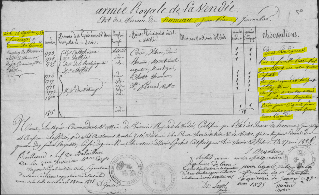 Sur son état de services dans l’Armée Royale de la Vendée, de 1793 à 1815, sont notées les observations suivantes :