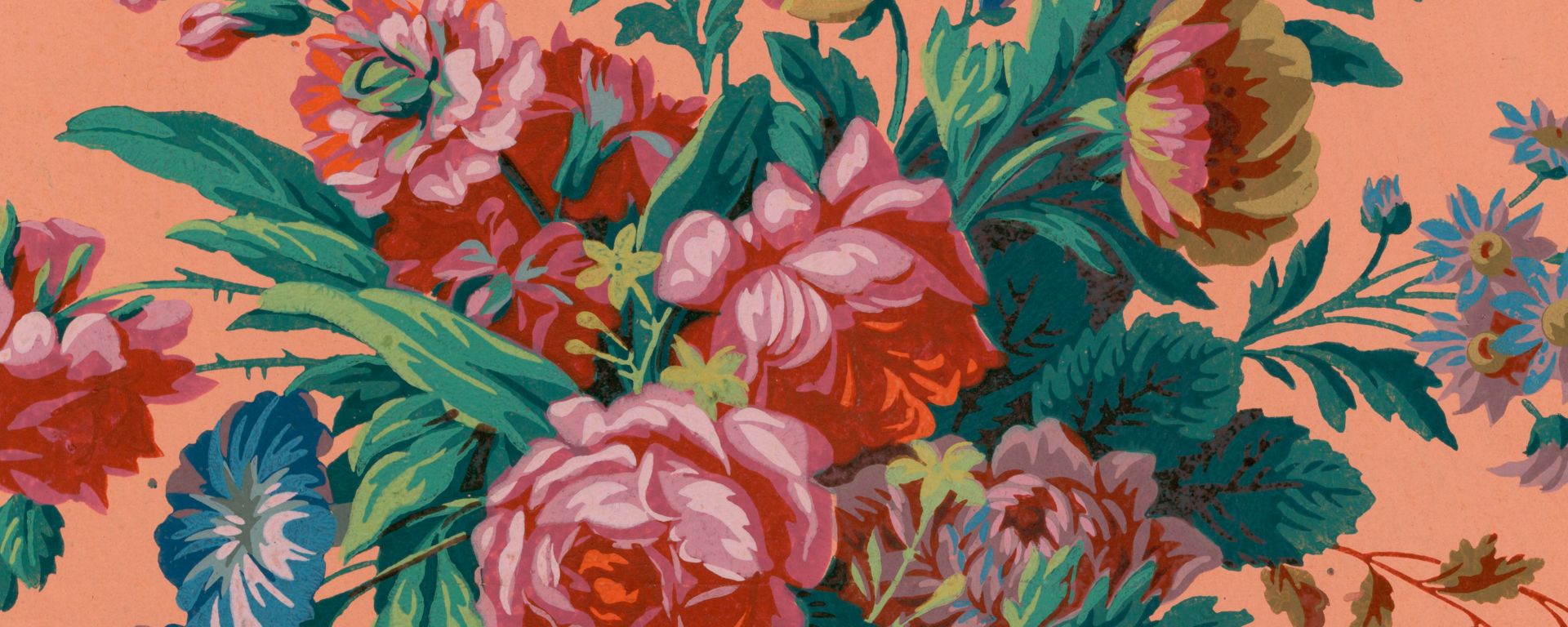 Vignette – Manufacture Jacquemart et Bénard. Papier à motif répétitif. Motif répétitif en arabesque à un chemin : lambrequin en marbre supportant deux putti entre deux vases et alternant avec des festons de feuillages et de fleurettes stylisées. Paris1799. (GallicaBnF)