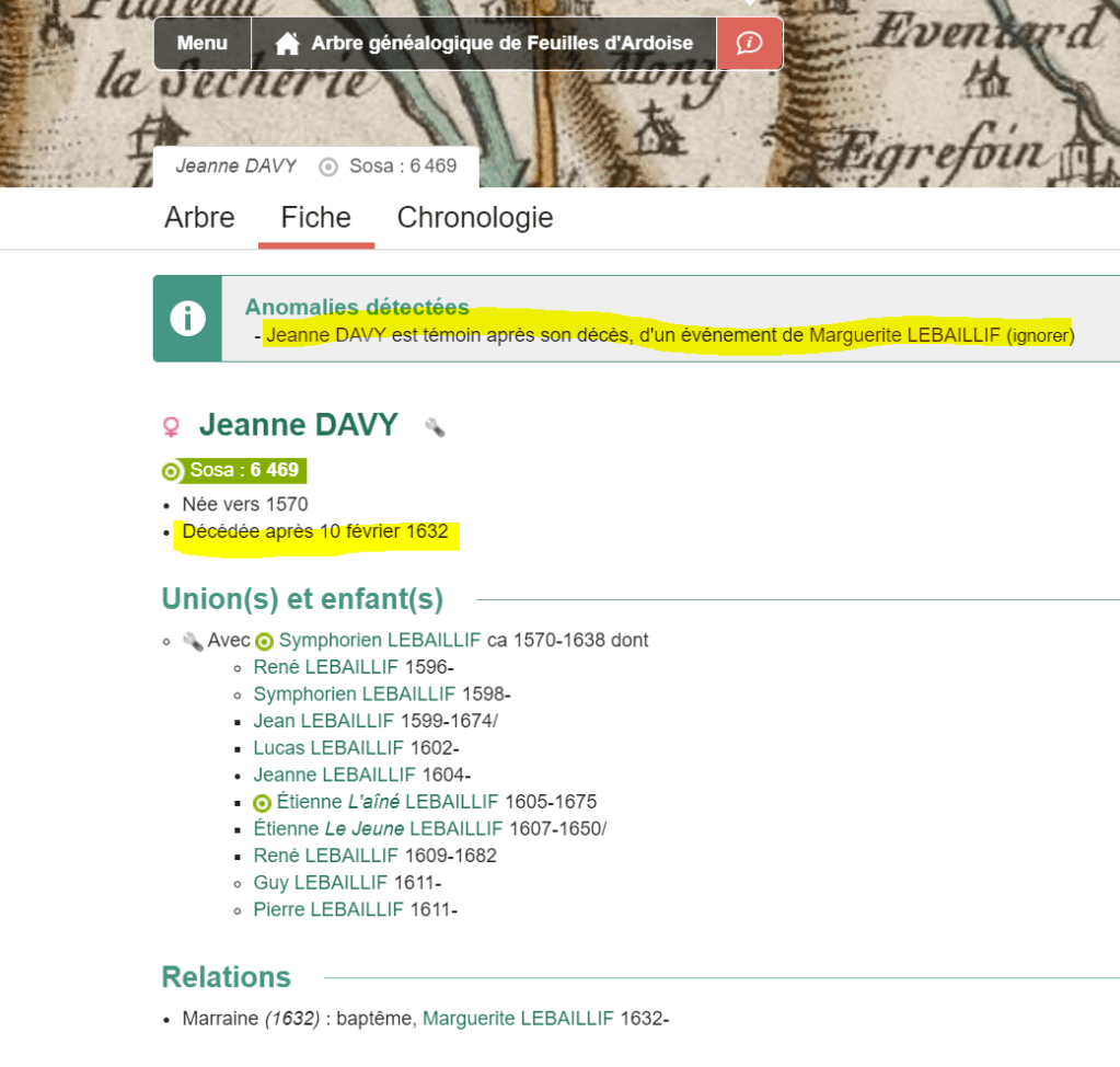 Puisque Marguerite LEBAILLIF, sa petite fille, a été baptisée le 10 avril 1632, c’est que Jeanne DAVY, sa grand-mère était encore en vie après le 10 avril 1632 (et non le 10 février de cette même année). Il me suffit juste de modifier la date à partir de laquelle elle n’est peut-être plus en vie.